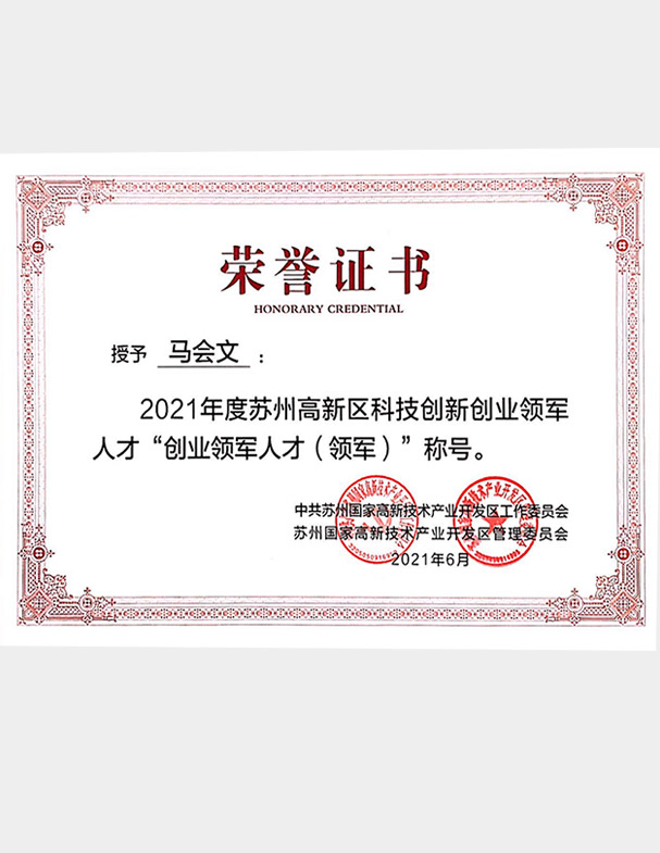 2021年度蘇州高新區(qū)科技創(chuàng)新創(chuàng)業(yè)領(lǐng)軍人才“創(chuàng)業(yè)領(lǐng)軍人才(領(lǐng)軍)”稱號。